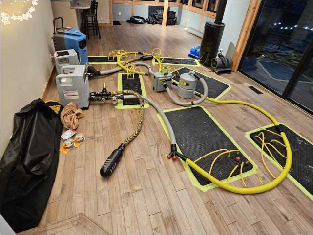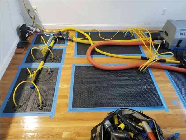 Remove as much excess water as possbile by mopping or open doors to allow water to escape.